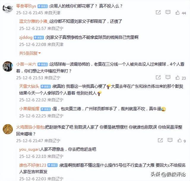 媒体人付政浩发文点评:“辽篮输江苏肯帝亚后又输给广州龙狮,进攻出了大问题,百回合得分只有95分。巧妇难为无米之炊,杨鸣也很无奈。当然,辽篮这种阵容配置特别是外援的成色也说明俱乐部进入了后王朝时代的调整过渡期。只要能培养出一到两位新星,就算是重大收获。 ”