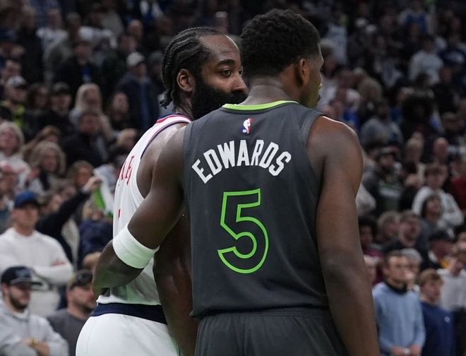 当然不能指望哈登防守端还要承担责任,但还有一个数据引人深思:上赛季哈登和伦纳德同时在场时,快船百回合能赢对手14.7分,特别是全明星周末过后,快船的净效率值是联盟前三!但本赛季哈登和伦纳德同时在场时,快船百回合输对手5.0分,大致等于球队净效率值(-5.3)。打热火第四节被弃用,当球队在小卡带领下疯狂追分时,哈登眼神空洞陷入沉思,没再关注球场动态。那一幕很容易让人联想起哈登在篮网效力时最后两周的情况,心不在焉,效率大幅下滑,缺乏斗志,这绝对不是哈登的比赛风格。