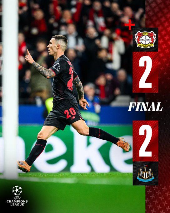 欧冠 勒沃库森 2-2 纽卡斯尔联
